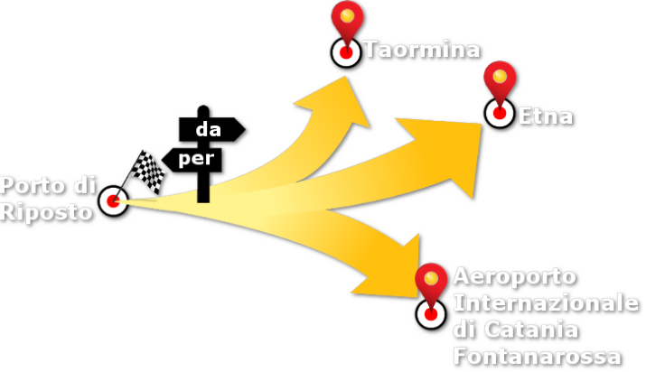 La Marina di Riposto si trova ai piedi del vulcano più alto d’Europa, ovvero l’Etna da qui il nome “Porto dell’Etna“, in una posizione privilegiata per poter raggiungere su richiesta facilmente sia l’aeroporto Fontanarossa di Catania, sia molte tra le più belle località turistiche della Sicilia orientale, tra i quali la maestosa Etna (zone sommitali Rifugio Sapienza zona sud, Piano Provenzana zona nord), Taormina, Castelmola, Caltagirone, Savoca, Siracusa, Noto, Piazza Armerina, le Gole dell’Alcantara, Ragusa Ibla, Modica, Agrigento, Catania, la Riviera dei Ciclopi (Aci Trezza, Aci Castello etc…etc).